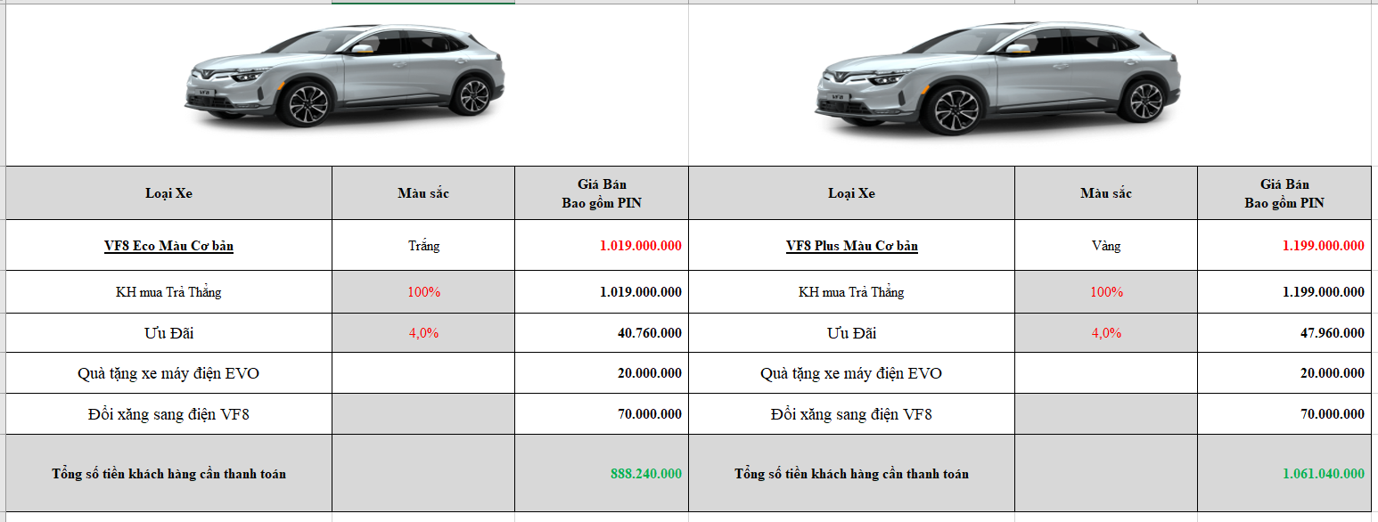 - VinFast VF 8 Plus Pin CATL (Gồm Pin): 1.199.000.000 VNĐ