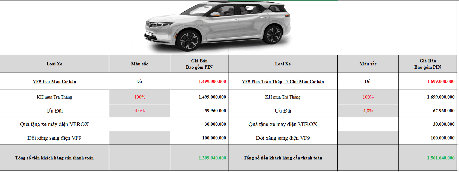 - VinFast VF 9 Plus Trần Thép Pin CATL, điều hòa 3 vùng (Gồm pin): 1.699.000.000 VNĐ